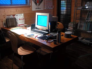 ・自宅のPCデスクにて(PCメンテナンス日記) 首に掛けているのはスカイプ用のヘッドセット。 |