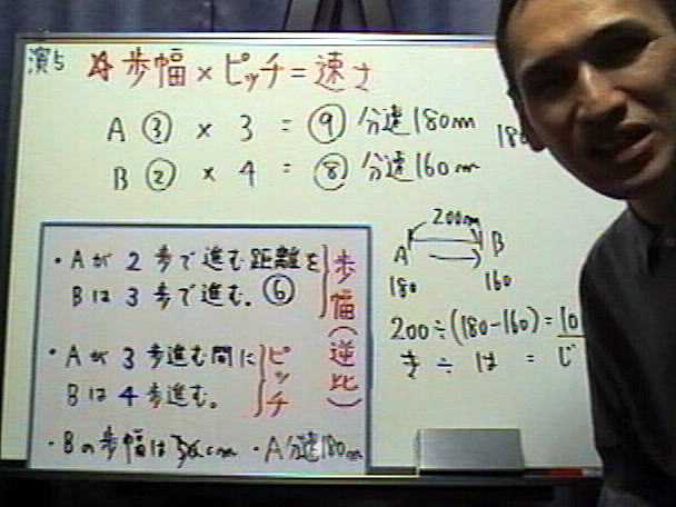 Aが3歩進む間にBは4歩進み、Aの2歩の長さはBの3歩の長さに等し