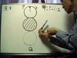 | 直径8cmの円板Aに図のような方向に矢印をつけて同じ直径8cm の円板Bの周りを滑らないようにPの位置から時計回りに転がしなが ら1周させた。このとき図のQの位置(真下)では円板Aの矢印はど ちらの方向を向いているか。※ただし、Pは円板Bの12時の位置 でQは円板Bの6時の位置とする。(EN-008) 1.↑ 2.→ 3.← 4.↓ 5.1〜4以外の方向 |