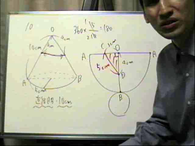 底面の直径ABが10cm、母線の長さが10cmの直円錐がある。