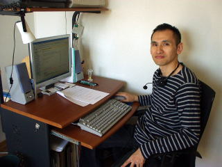 ・自宅のPCデスクにて(PCメンテナンス日記) 首に掛けているのはスカイプ用のヘッドセット。 |
