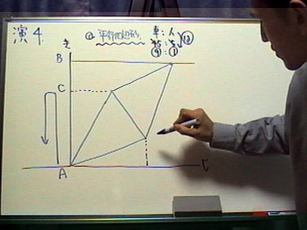 【超高速解法のヒント&コメント】 ・一見かなり複雑そうに思えますが、問題文にそって順番に丁寧にダイヤグラムを書くのがポイントです。 ・この問題はある意味ダイヤグラムを使う問題パターンの「最高峰!」とも言えます。最初自分では解けなくても、解説で最終的な「図形」を一度見ておけば次回に類似問題を解く時は楽勝です。 ・謎を解決するキーワードは「平行四辺形」です! |