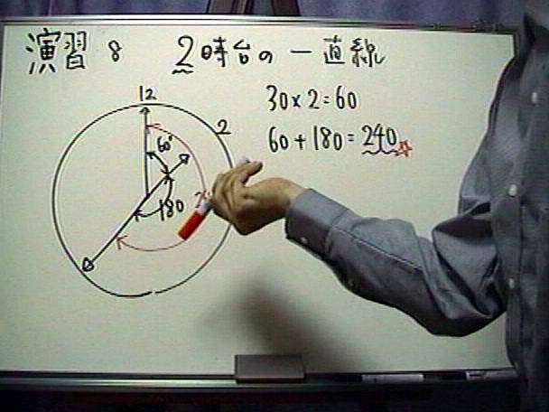 【超高速解法のヒント&コメント】 ・逆向きに一直線とは「180度」ということです。 ・もちろん方程式は不要です。 |