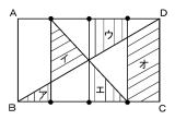 | ≪レベルC≫(制限時間 60秒) 長方形ABCDの辺ADと辺BCをそれぞれ . 4等分した各点と頂点B及びDを右図のよう に結んだとき(ア+イ):(ウ+エ+オ)の面積比 を求めよ。(EN-010) 1.1:3 2.2:5 3.3:7 4.4:9 5.5:11 |