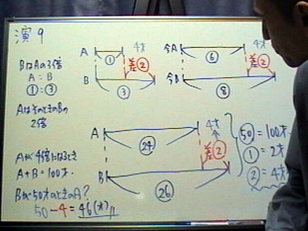 【超高速解法のヒント&コメント】 ・年齢算の「名作」です。 ・「AとBが最初に出会ったとき・・・」という出だしに気をつけて、 順を追って解いていきます。 |